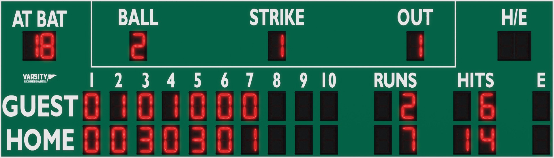 A larger baseball/softball scoreboard incorporates inning-by-inning scoring, At Bat, Ball, Strike, Out and Hit/Error displays as well as Total Runs, Hits and Errors.