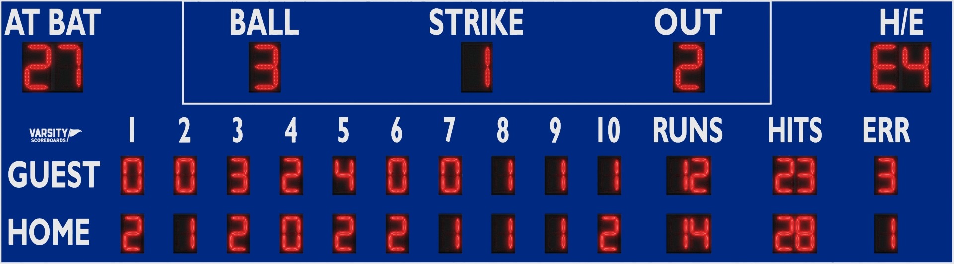 Our largest baseball/softball scoreboard incorporates inning-by-inning scoring, At Bat, Ball, Strike, Out and Hit/Error displays as well as Total Runs, Hits and Errors.