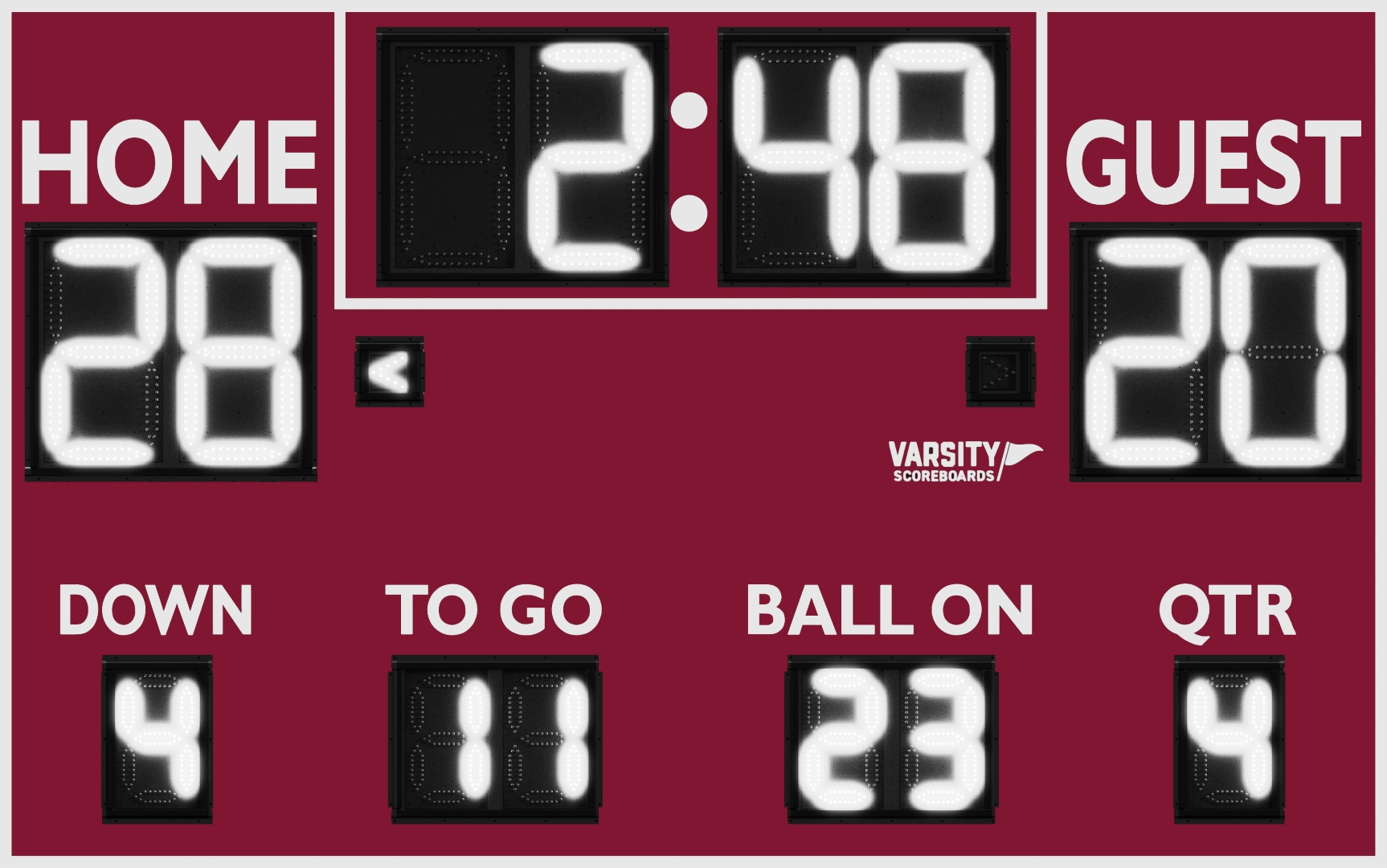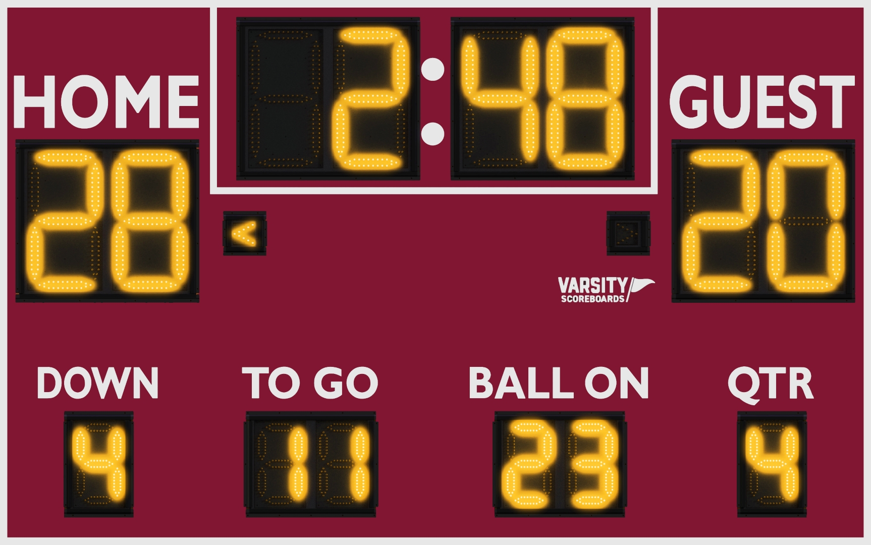 For the base price, you will receive the scoreboard, standard controller, and your choice of premier powder-coat color (please specify background color, lettering and trim). Please ask your Varsity Scoreboards sales representative for more information regarding popular options that are available for an extra charge (some examples include: wireless remote control, conversion kits, custom powder-coat colors).