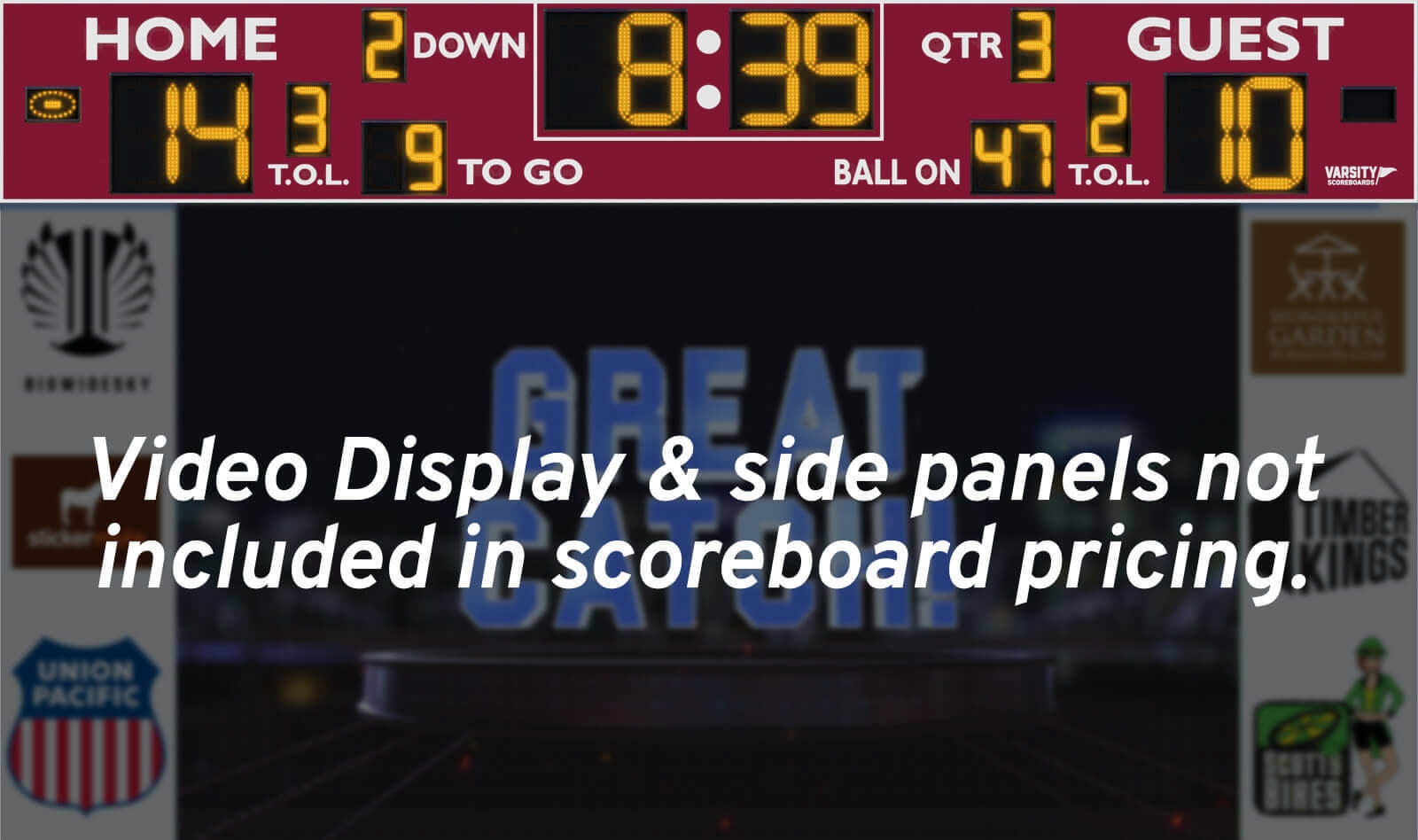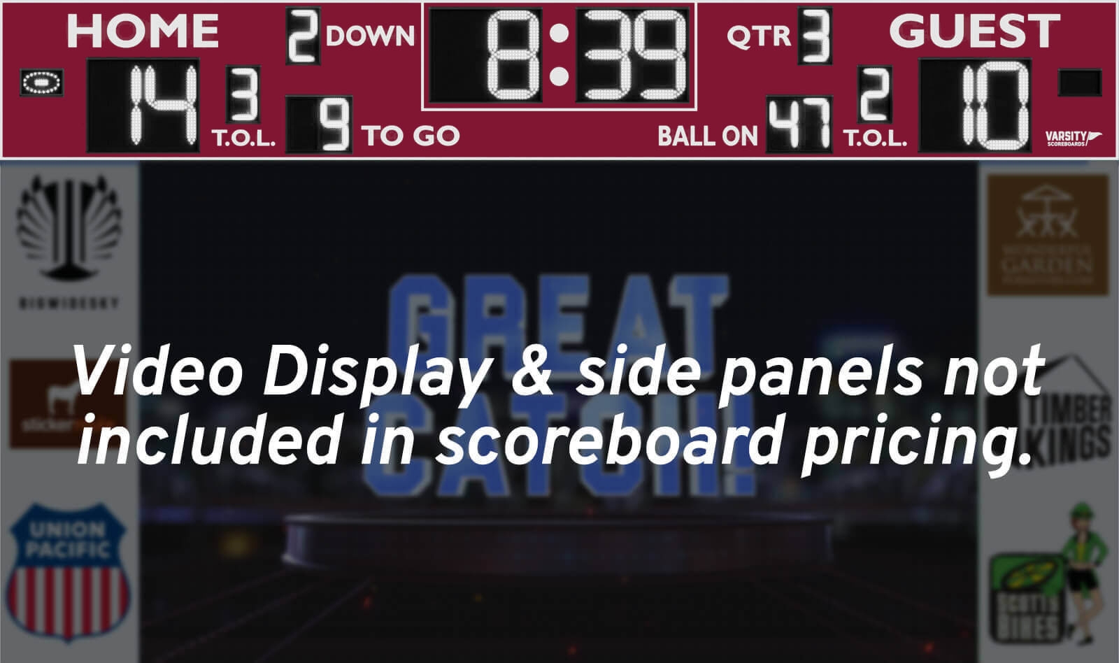 For the base price, you will receive the scoreboard, standard controller, and your choice of premier powder-coat color (please specify background color, lettering and trim). Please ask your Varsity Scoreboards sales representative for more information regarding popular options that are available for an extra charge (some examples include: wireless remote control, conversion kits, custom powder-coat colors).